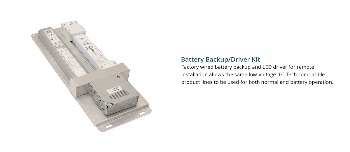 Kit includes 4” JB for 120–277V AC input direct wiring with metal conduit and single-piece charge indicator and test switch accessory