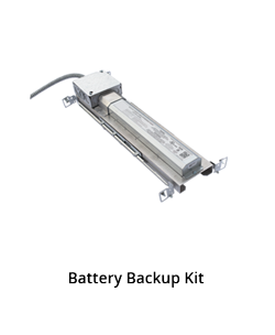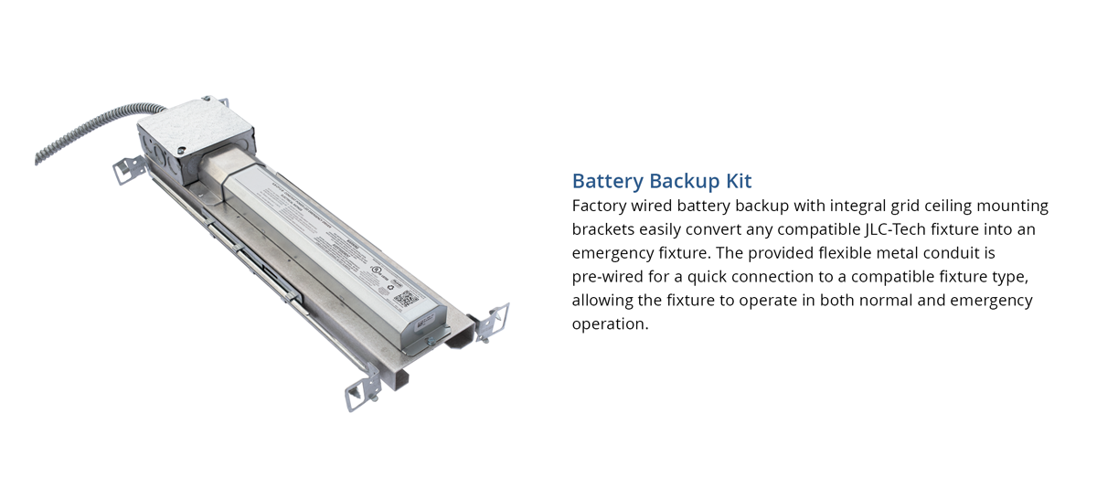 Kit includes 4″ JB for 120-277V AC input wiring, adjustable TBAR mounting brackets, surface mounting holes, 24″ flexible metal conduit with wiring to compatible fixture, and single-piece charge indicator and test switch accessory, (face plate not provided)
