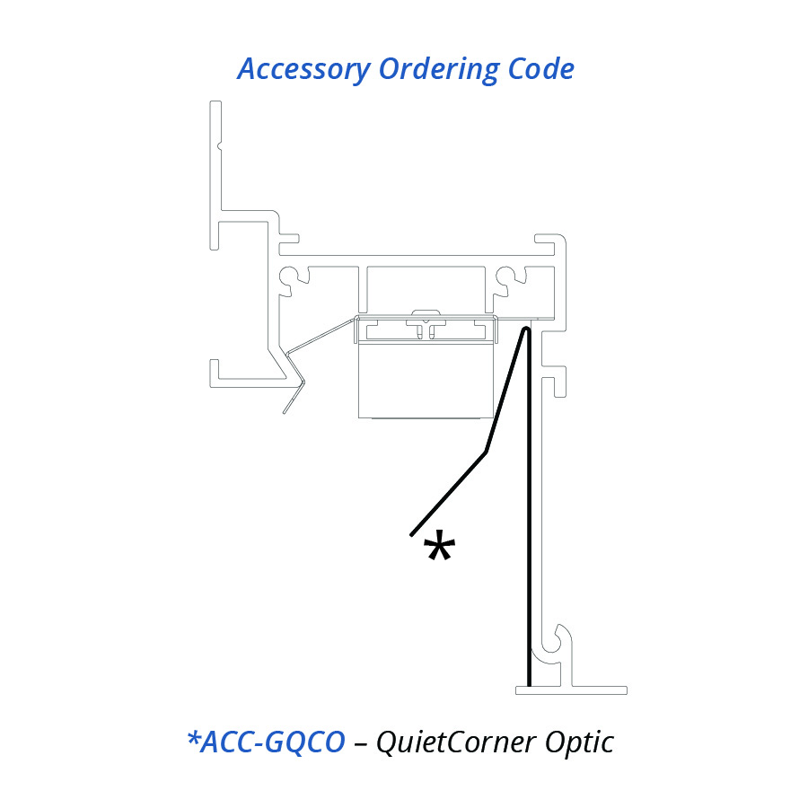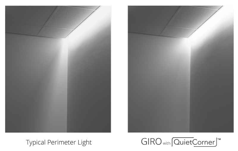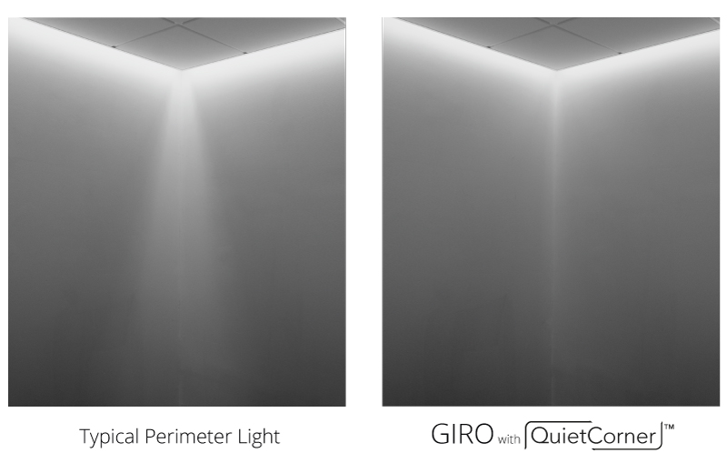 The GIRO QuietCorner optic is a simple accessory (sold separately), that can be snapped into place at any inside corner, when using the ambient or cove glow distribution. With QuietCorner, the resulting illumination on the wall is smooth and consistent, along the wall and through the corner.