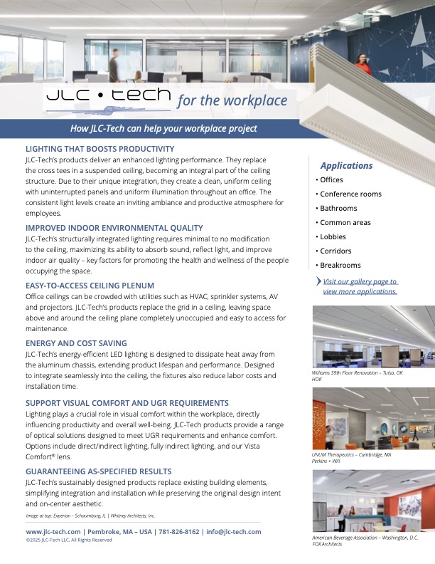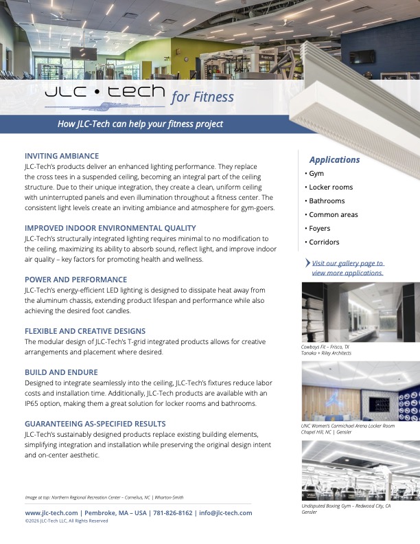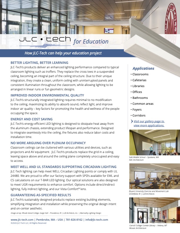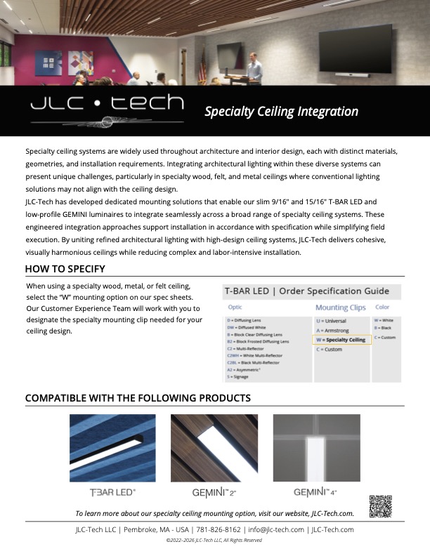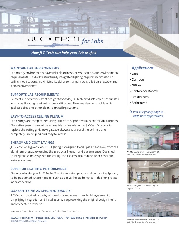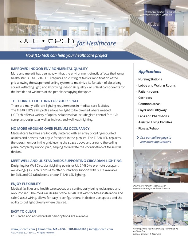 T-BAR LED Brochure AGU Case Study JLC-Tech For Transportation JLC-Tech For Education McMillan White Paper At a Glance JLC-Tech Extended Brochure Specialty Wood/Metal/Felt Flyer JLC-Tech For Fitness JLC-Tech For Labs Layout Sketch Sheet Seaport Science Case Study JLC-Tech For Healthcare JLC-Tech For The Workplace Vector Design Guide Ceiling Grid Compatibility for T-Grid and Slot Integrations