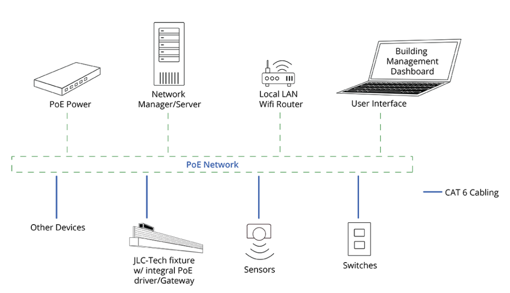 JLC-Tech fixtures combined with Power-Over-Ethernet technology offers the benefits of simple fixture installation along with the digital functionality of a PoE system to provide cost-saving network connected lighting. By replacing cross tees in a suspended ceiling with light fixtures powered by PoE technology, JLC-Tech now offers a fully integrated digital building solution. JLC-Tech fixtures are available with PoE drivers from some of the leading edge PoE system providers.