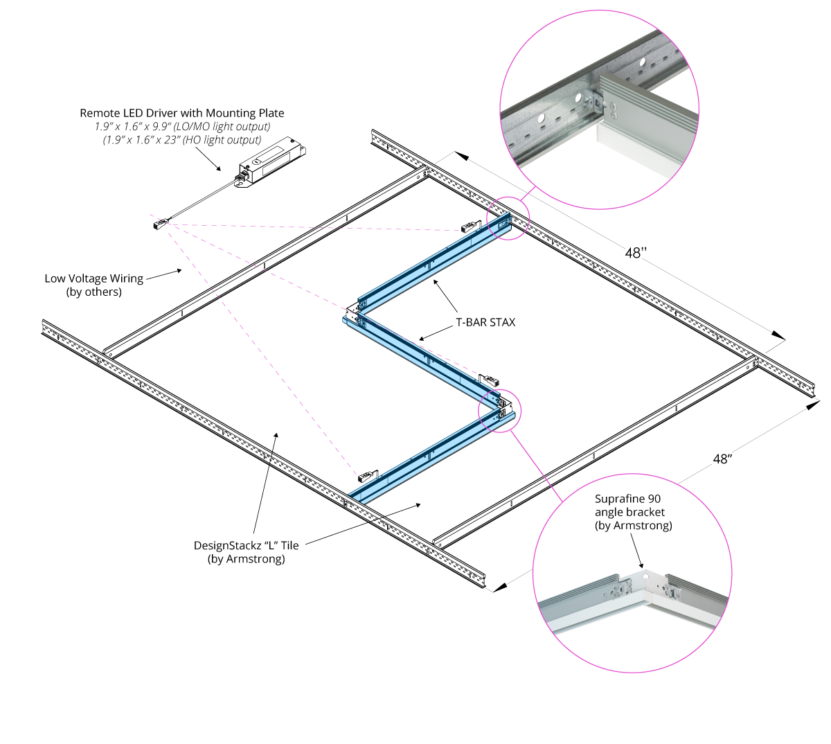 Using the T-BAR STAX with this ceiling system also allows for a fully illuminated Z shape of light within the DesignStackz 4′ x 4′ ceiling module with precise 90 degree corners. The “Z” kit configuration comes with (2) 22” T-BAR STAX and (1) 20” T-BAR STAX fixtures, and a single power supply is provided for the entire kit.